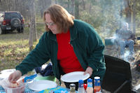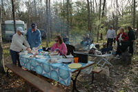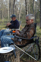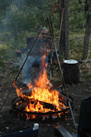 All the meals are cooked on the open fire. The guys do the dirty part of cooking the grub over the fire. We have plenty of wood so the fire is usually going from the start to the end of the weekend.