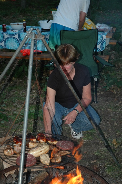 | | .. | | Ellen and Brad preparing the meal over the open fire. We always have some great vittles cooked over the fire. | |