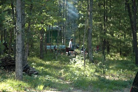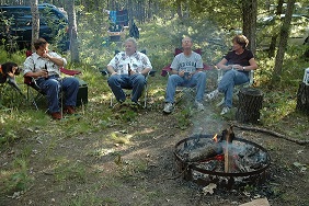| | Brad, Ellen, Scott and Carolyn catching up on past events and telling stories of what's to come. | | Robert, Jordon, and Jason getting ready to add wood to the fire. | |